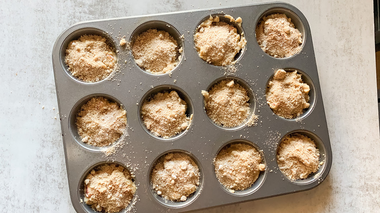 - Sprinkle the streusel topping evenly onto each muffin cup.