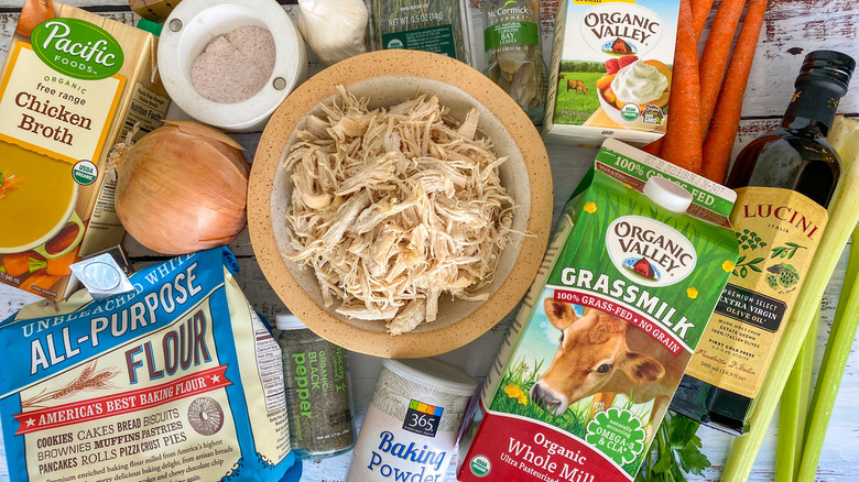 There are essentially two main parts to this dish: the creamy chicken soup and the dumplings themselves. To make the chicken soup, you'll need a few carrots, an onion, some garlic, chicken broth, cooked and shredded chicken, olive oil, fresh thyme, and a few bay leaves. The dumplings call for flour, baking powder, milk, and butter, while the dish is finished off with heavy cream.