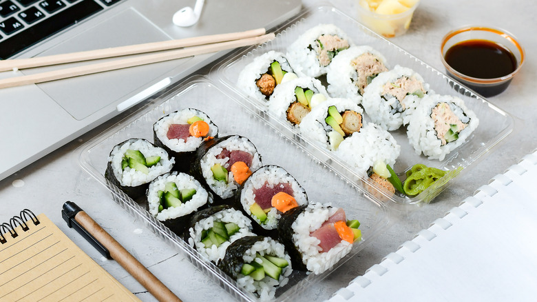 Good news and bad news — you can absolutely take home that sushi from the supermarket or restaurant and enjoy it at a later time, but you need to make sure that "later time" is within a 24-hour window. According to Spoon University, "The important part to remember is to not leave it unrefrigerated because bacteria can actually grow on sushi that has a raw component, such a spicy tuna rolls and sashimi (which is basically just slices of raw fish)."