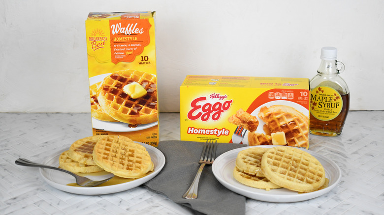 Both the Eggo and Breakfast Best waffles are sold in boxes designed with lots of yellow and images of maple syrup-smothered waffles topped with melting pats of butter (we're already hungry). Each box contains 10 waffles and claims an identical net weight of 12.3 ounces so it's safe to assume the waffles are the same size. But there's definitely a difference at checkout. Our box of Eggo waffles rang up at $3.89 per box before tax, which we didn't think was an outrageous price. That's roughly 39 cents per waffle which means you can enjoy a quick and satisfying breakfast for about a dollar — not bad.