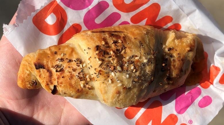 The croissant stuffer is served warm and topped with an everything bagel style seasoning. It's then filled with just the right amount of cheese, bacon, and chicken. The meats and cheese are rolled right into the croissant, so you don't have to struggle with a sandwich that's falling apart as you try to eat it. In fact, it can be easily eaten one-handed while walking around with your coffee in the other hand. If you've had any of the other Dunkin' Donuts croissant breakfast sandwiches, you're aware of how deliciously buttery they are, but you probably also know that they're a two-handed affair. You get all of the same buttery croissant goodness with the ease of a whole pastry.