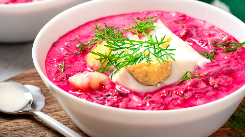 As Americans, when the topic of summer soups comes up, our minds tend to go immediately to brightly colored gazpachos or lightly spiced broth-based vegetable soups like minestrone or summer vegetable. What we do NOT tend to conjure, by contrast, are images of thick and creamy soups. But that's just us over here. Over in Poland, one of the most popular and classic summer soups is a creamy type of borscht that is served cold. This soup is commonly referred to as chlodnik, although the term chlodnik is also used to refer generally to any number of cold summer soups. The style of chlodnik that refers specifically to creamy cold borscht starts with the same simmered beets as the hot beet broth known as barszcz czerwonyts. However, the resulting dark-red beet broth is then blended with "cucumbers, radishes, and various milk products, such as yogurt, kefir, sour milk, or sour cream," according to TasteAtlas, which notes that "the result is a refreshing, vibrant pink soup that ideally soothes the heat."