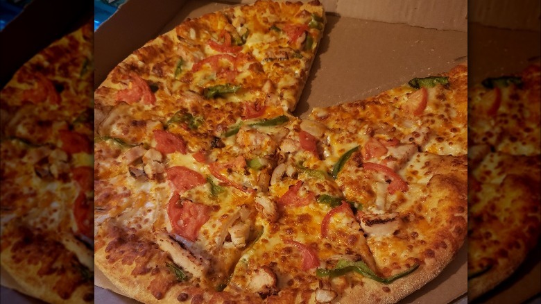 Instead, the Chicken Taco pizza listed on the Domino's menu starts out with the crust of your choice, which is then topped with taco seasoning, grilled chicken, and a trio of American, Provolone, and Cheddar cheeses. Diced tomatoes, onions, and green peppers complete this standard makeup of this delectable pie, though you do have the option of customizing your order with the addition of other toppings such as jalapeños or banana peppers. Regardless of how you choose to dress your Chicken Taco pizza, the Domino's website promises will be so good, you won't even miss the taco shell.