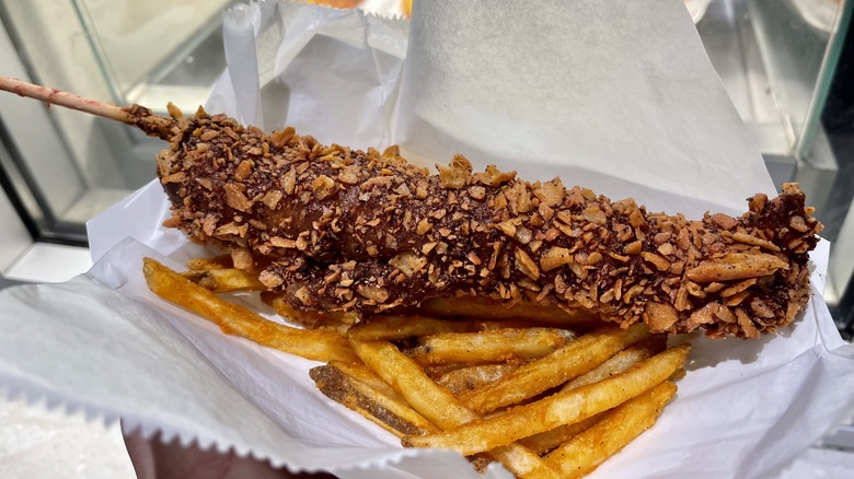 The holy grail here is their seasonal Takis corn dog. After the hot dog is hand-dipped in their signature batter it is rolled in crumbled Takis, the popular Mexican corn tortilla chip. This gives the dog a welcomed crunch and packs a whole lot of flavors thanks to the heat the Takis bring to the table. You will be singing its praises ... "Taki, Taki!"