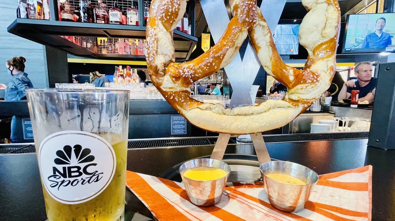 Our touchdown of a way to hang here? Throw back a few beers and design our own feast out of their standout appetizer selections. The guac bowl is delicious with charred corn and cotija, and you could never go wrong with crispy wings — especially their unique take on the sports bar favorite coated in a pad Thai sauce. The absolute must is the colossal artisan pretzel that's crispy on the outside and super soft on the inside — it is also so big a plate just didn't suffice. It is served with addictive beer-cheddar queso made in-house and creamy Bertman's mustard.