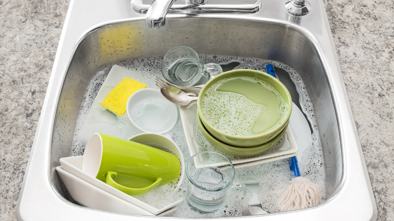 For dishes with stuck-on food, one of the best ways to help alleviate the food from the pan is by soaking the dish in water and soap. Because of this, you may have to rearrange the sequence in which you clean dishes in order to create space. According to the American Cleaning Institute, it's important to first remove food scraps with a rubber spatula or paper towel. Afterward, add soap and hot water to the soiled cookware and allow it to soak for 15 to 30 minutes. Alternatively, if you have multiple dishes that need soaking, CNET recommends doing it bubble bath style by plugging the drain and filling it with hot water and soap, which allows all dishes to soak at once.