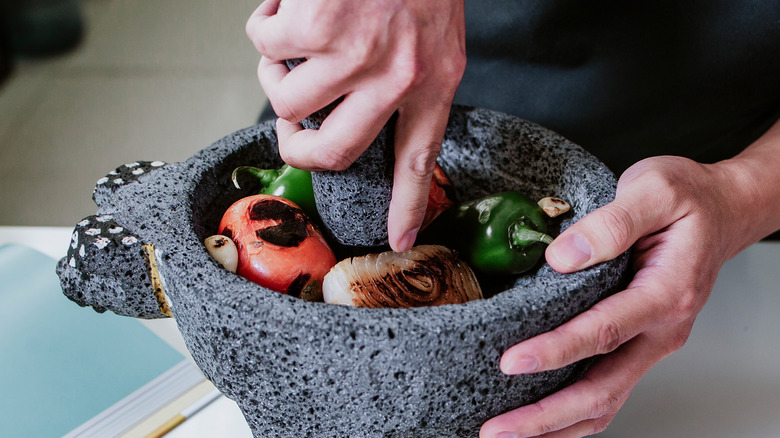 The mortar and pestle, also known as a molcajete, is a kitchen tool used for crushing and grinding items to release their flavor and better blend them into a dish. The device is commonly used in crushing herbs or making dips such as guacamole. According to Healthyish, it's best to look for a mortar and pestle about 6 inches wide and 3 inches deep. This size means you can use it for many processes, from creating dips to releasing herbs' flavors.