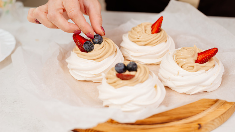 Broma Bakery offers a couple of tips for making a pavlova at home. They say to use granulated sugar, as it not only sweetens the whipped egg whites, but also helps to aerate them and add some crunch to the outer layer. The bakery emphasizes the importance of beating the sugar into the eggs long enough to dissolve the granules, noting that if you rush through this step, you run the risk of having a pavlova with a gritty texture. Pro tip: Run the sugar through the food processor or blender before using it as the finer the texture, the more quickly it will dissolve.