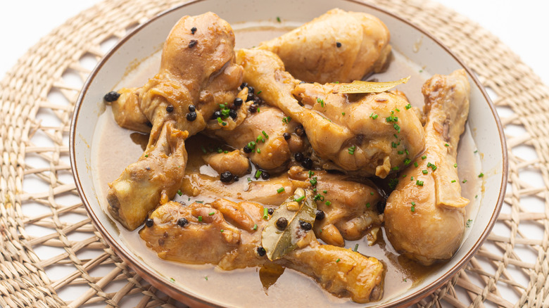 Now, the chicken adobo is ready to be served! Olayinka suggests coordinating this entree with side dishes like, "Rice, bulgur wheat, [or] potatoes." Not only is this entree good to you, but it's good for you. Chicken is a healthy source of protein with various nutritional benefits (via WebMD). If you start doing a happy dance as you enjoy this meal, it might be because chicken contains an amino acid that creates the feel-good hormone serotonin in our brains, WebMD explains.