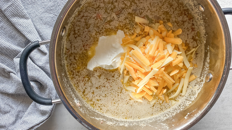 - Add sour cream, cheese, salt, and pepper and stir well.