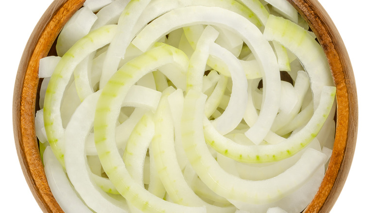 This change in flavor is because of the internal structure of cells within the onion that contain the chemicals that make it taste sharp. Inside the onion, "the layers of plant cells in an onion run from the root to the stem end of the bulb, the direction in which you slice onions can make a big difference in their cooked appearance and texture," according to Cooks Illustrated. Disrupting that structure by slicing crosswise causes the onions to soften, and break down easier while slicing lengthwise keeps the structure intact and preserves the shape when cooked (via Cook's Illustrated.), so when sliced lengthwise, the knife slices along the line of the cell walls, and less of them get torn open. However, when cut crosswise, the cell walls don't line up the same way, and the knife tears through them, releasing the gas that gives onions their intense aroma and flavor. This gas is what makes us cry and gives onions their distinctive flavor (via Misen.)