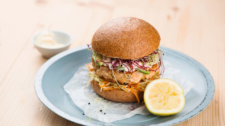 Whipping up a salmon burger is a great way to get all the nutritional benefits of eating fish while still satisfying your true desire to chow down on burgers on the reg. Meaty, rich salmon is the ideal fish thanks to its mild flavor and almost creamy texture. When you turn it into a burger, a whole new world opens up insofar as toppings. Depending on how you dress it, this dish can go from being reminiscent of zesty Cajun flavors to highlighting deeply savory Asian ones.