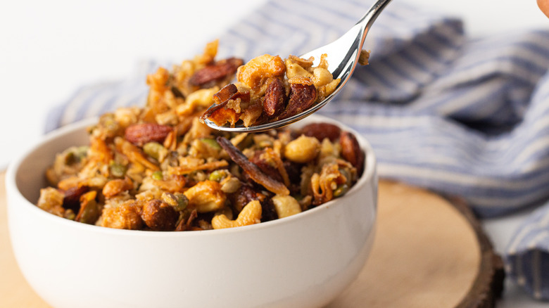 While this keto granola is quite tasty, it might not feel like a complete, satisfying meal for some folks. So let's talk about a few foods you can add to the mix without throwing off the keto part of the meal. Lots of fruit is naturally high in carbs, but according to Everyday Health, berries are a decent choice if you're looking to make breakfast a bit richer. Cauliflower and broccoli are both good choices to snack on at lunch, as area lean deli meats. And if you need something to crunch on alongside your granola, try seaweed chips or, of course, more seeds and nuts. You can also eat your granola with milk as a cereal, but make sure you choose a keto-friendly milk alternative, like almond or coconut milk. Just pay attention to added sugars and net carbs.