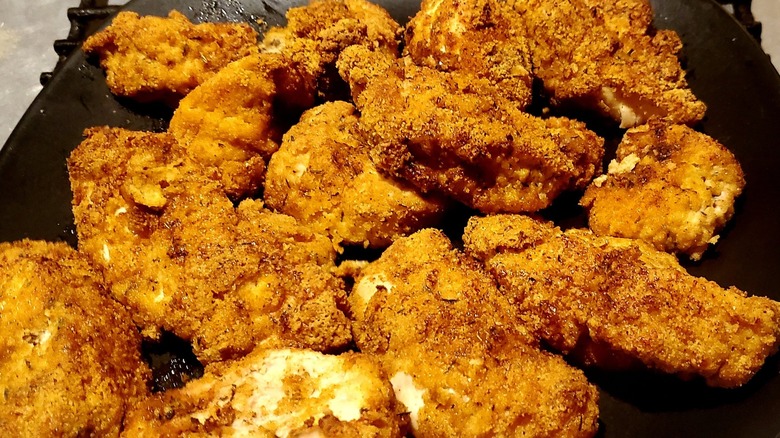 Southern Living also suggests not adding too much breading to your chicken, especially when it comes to the flour part. If you do, you could end up with soggy chicken. To make sure you get even amounts of everything, consider putting the flour and breadcrumbs into separate bags and using them to coat the chicken pieces evenly by shaking the bags.