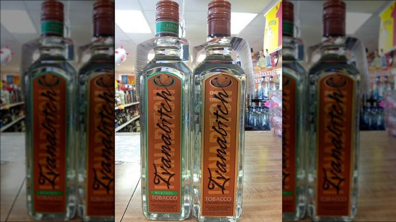 While "Ivanabitch" might sound like a joke brand put out in 2017 by someone who was no fan of the then-POTUS, or at least his ex-wife, it's actually a Dutch brand. The brand's slogan is "vodka with attitude," but most of their lineup consists of pretty standard flavored vodkas: cherry, blackberry, peach, coconut, vanilla, etc. They do have two real oddball ones, though, meant to appeal to ... we're not quite sure. Gag gifters? The easily amused? Definitely not vodka connoisseurs, though. According to Drinkhacker, both the tobacco and menthol tobacco flavors are about as good as you'd expect — which is to say, not good at all.