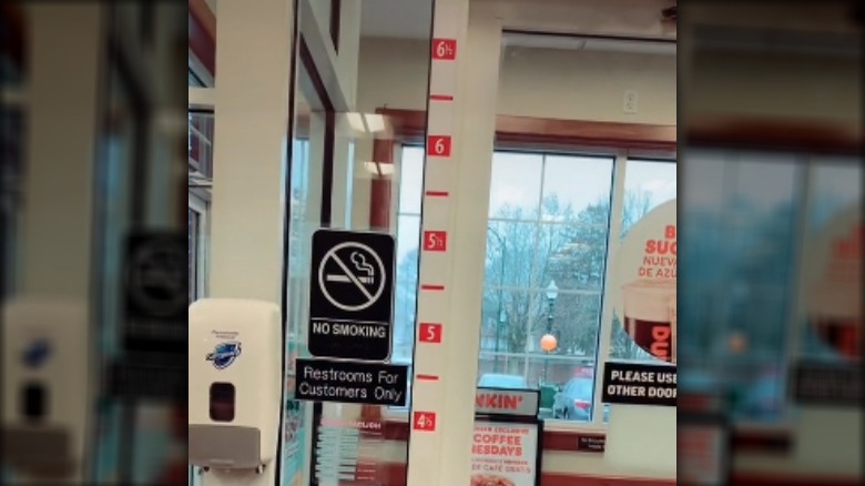 A viral TikTok video — uploaded by user @officialjuice93 and viewed more than 500,000 times — shows a red height chart with measurements in feet lining a door inside a Dunkin' shop. "Tell me your Dunkin' has been robbed without telling me they've been robbed," the video's caption reads. Why would a Dunkin' have a height chart inside, and what would it have to do with robberies?