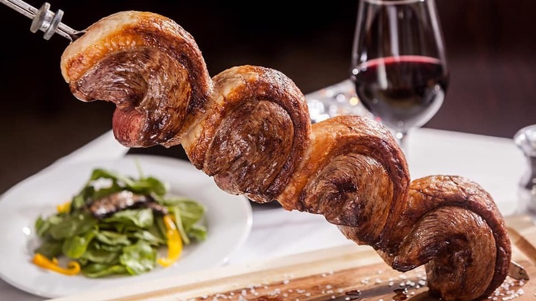 Chima Steakhouse's rodízio also consists of less meaty delights such as mixed veggie skewers and salmon with pesto or passionfruit sauce. Replete with colors and textures, the restaurant's oversized salad bar also delivers a huge range of hot and cold items. There are soups, salads, cold cuts, and cheeses. There's even farofa, a traditional Brazilian side made from yucca flour that has been compared to spicy breadcrumbs, per Creative Loafing Charlotte. Last but not least, the meal can be topped by more than a dozen dressings and homemade sauces from staples of the likes of ranch dressing and red wine vinegar to more unusual concoctions, such as Brazilian chimichurri, vinaigrette, and mint jelly (via Chima Steakhouse).