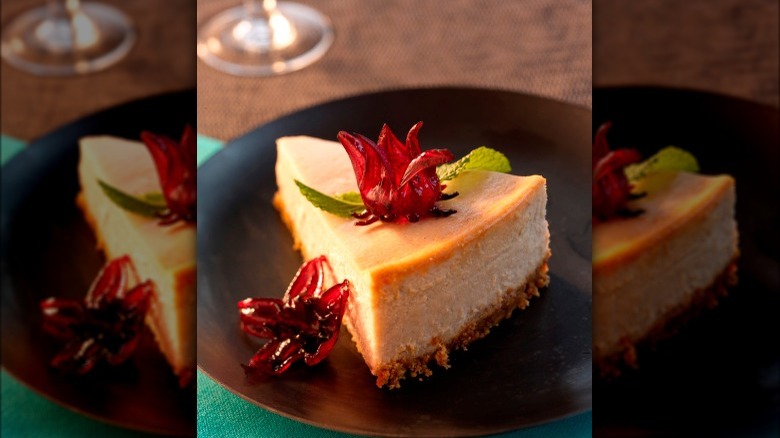 Hibiscus is not just enjoyed in beverages, but also consumed as a food, and many of the edible preparations you see will be in the form of a jam or jelly, as shared by Bon Appétit. Some suggested preparations include "candying" the calyxs (boiling with sugar and spices such as ginger or clove), using in stir frys or sauces, tossing fresh hibiscus in salad, simmering with greens, or even creating a puree. Australia's Wild Hibiscus Flower Co. specializes in preserving whole hibscus flowers (calyxs) in syrup, which can make a vibrant yet simple garnish for desserts — such as atop cheesecake.