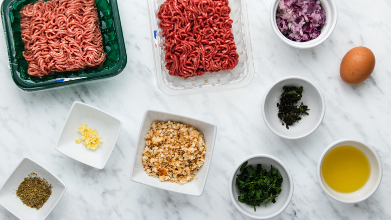 Now that you have all your ingredients, it's time to get started on the prep work. Add everything you purchased from the store (aside from the olive oil) to a mixing bowl that's large enough to fit everything. Toss in the ground beef, ground lamb, a large egg, breadcrumbs, red onion, garlic cloves, fresh parsley, chopped mint, dried oregano, salt, and pepper. This makes up your meatball mix!