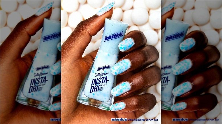 Sally Hansen, a long-standing and well-regarded beauty brand, jumped on the foodie bandwagon in 2021 when it partnered with Mentos, the mint company that's been around since 1932. The collaboration between the two companies produced eight stunning shades of Sally Hansen's Insta-Dri nail polish. As per The Pop Insider, the limited-time collection was called Sweet Treats for Spring and introduced colors ranging from eye-catching pink to pastel yellow. A cool white polish with blue glitter — the two brand colors of the original mint Mentos — was also in the collection.