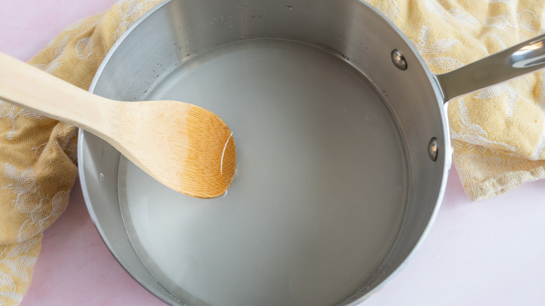- In a saucepan, add in the sugar and water. Whisk to combine, and then bring to a simmer for 5 minutes.