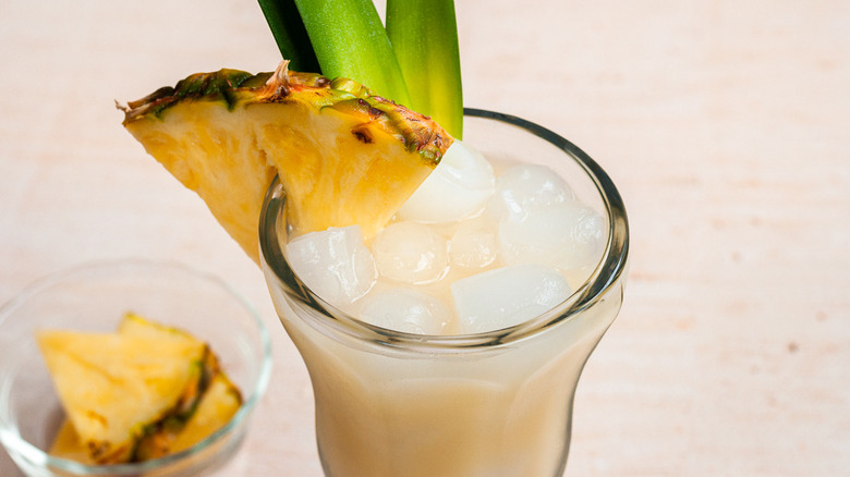 To make this drink, you need dark rum, and if you want it to be 100% authentic, then you'll specifically want Pusser's dark rum (but we won't tell if you use whatever is in your liquor cabinet). You will also need both pineapple and orange juice, along with either coconut cream or coconut milk (the former is sweeter, and the latter is a lighter option.) Finally, you'll want some pineapple wedges for garnish, and maybe even some pineapple leaves for an extra tropical touch.