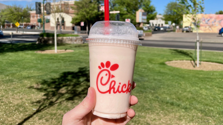 Per Chick-fil-A's website, the Frosted Cloudberry Lemonade is a regular Frosted Lemonade with cherry blossom and cloudberry flavoring. A Frosted Lemonade is a blend of lemonade and Icedream. Yes, Icedream, not ice cream. As we've covered before, Chick-fil-A's vanilla soft-serve dessert does not meet the legal requirements to be called ice cream because it doesn't contain enough fat. However, we won't hold that against it, because it's still really tasty. Although Chick-fil-A lemonade isn't squeezed in-store anymore, it's still delicious as well, so it's hard to lose with a combination of the two. If you'd like, you can substitute the lemonade for diet lemonade or iced tea.