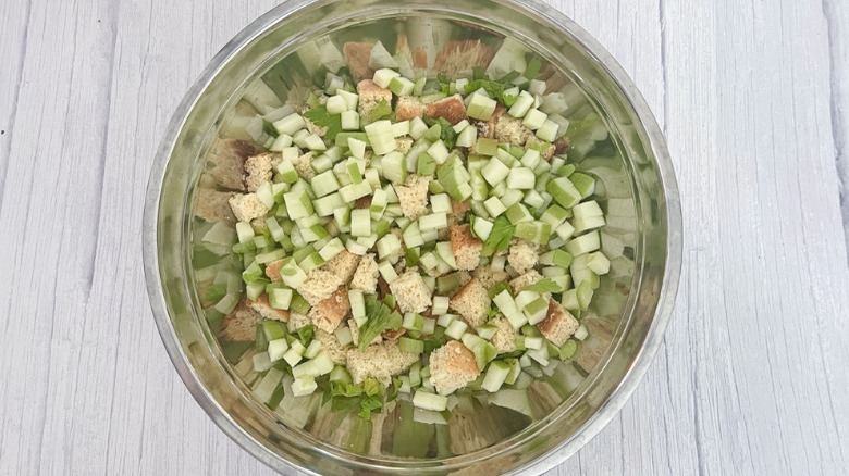 - In a large bowl, combine the cornbread cubes, celery, and apple. Mix to combine.