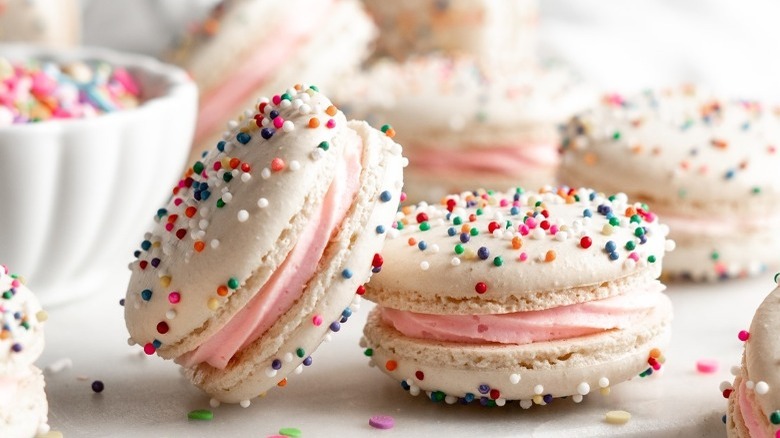 No, not English almond macaroons, which are a much denser and more classically cookie-like in nature (via Everyday Cooks). The French almond macaron is a buttercream concoction that incorporates almond essence into the outer shell, and usually opts for an almond-butteresque filling. It's a lot subtler than most macaron flavors, and certainly the "quietest" of all the macarons listed thus far. However, there is one occasion where almond macarons make a splash! Brightly colored almond macarons add a little zhuzh to any wedding reception as Jordan almonds stand-ins. As noted in Brides, Jordan almonds have long held symbolic merit in Italian and Greek weddings as a wish for a sweet, happy, and long life both for the newlyweds and their guests. Some believe the candy coating around the almond symbolizes the sweetness of love around a sometimes bitter life.
