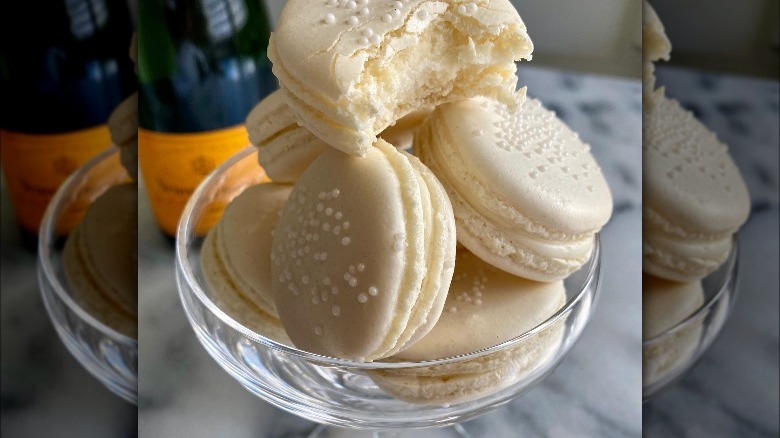 If taking to the kitchen yourself, there are a few things to take heed of. Just like baking with most boozy bevvies, a reduction should be made before baking with champagne. A recipe from Barley & Sage suggests boiling around half a cup of Champagne to 1/4 of a cup. Make sure to cool the reduction before adding it to the buttercream, lest the flavor and consistency be off. Those who are more into the eating than making should take a look at the macaron heralding from none other than Francophone Quebec. La Marguerite & Co. offers a Champagne buttercream macaron, providing the duality of a light and rich sparkling snack all in one. These macarons are particularly well-suited for larger crowds with food sensitivities, as they are not only dairy- and gluten-free, but also kosher pareve. The bakers add a final touch, literally, by incorporating a gold brush stroke on the mac's shell. Talk about nailing the landing.