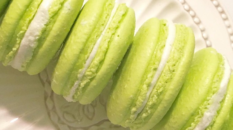 Now it's three-for-three on alcohol-adjacent or inspired macarons. There's just something about the collision of worlds that really makes for a thrilling dessert. Another boozy delight, margarita macarons like those concocted by food blog Mike Bakes NYC combine the sweet with the salty in these lime-green treats. While the baker suggests doing nothing different to the shell than adding a green food-dye, gel food-dye tends to perform best in making hand-made macs. It's really the filling that takes the lead in this recipe.