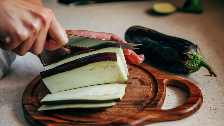 Cutting any produce correctly can help make a meal. According to NPR, cutting vegetables can actually affect the way they taste and the final result of a carefully crafted recipe. Thankfully, eggplants are not overly difficult to cut, and with a few helpful tips, you will be cutting eggplant like a pro for all your recipe needs.