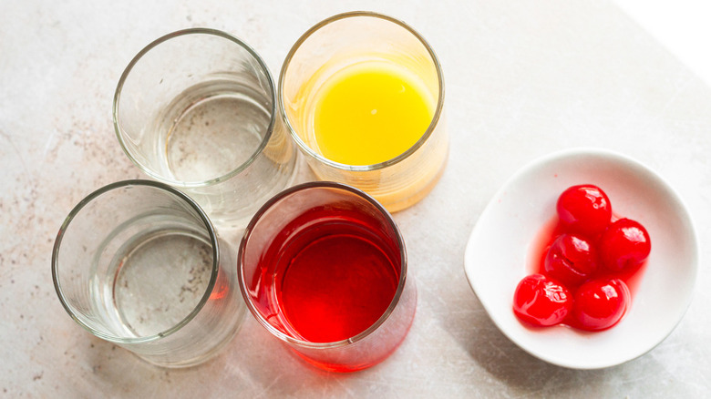 The first step is simple enough: Mix all of the ingredients (minus the cherry garnish). If you want to make up a batch of these drinks, you don't need to do any complicated math, as the proportions are pretty simple: 1 part of schnapps to 4 parts of everything else.