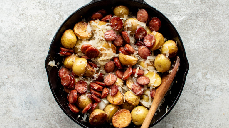 The best thing about a 1-skillet meal is that it makes cleanup and cooking incredibly easy. This recipe for a 1-skillet kielbasa and potatoes dinner combines baby potatoes that are roasted to perfection along with kielbasa cut into discs and perfectly browned. Add some onion. spices, and sauerkraut to the mix, and it's one filling meal. This dish is great served as a main course or as an appetizer.