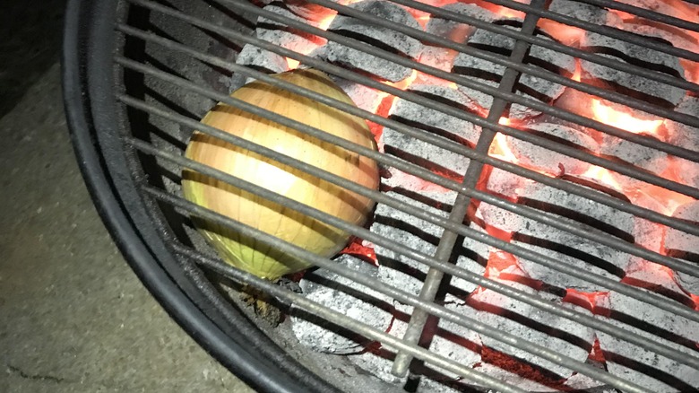 Grill a melting onion on barbecue coals