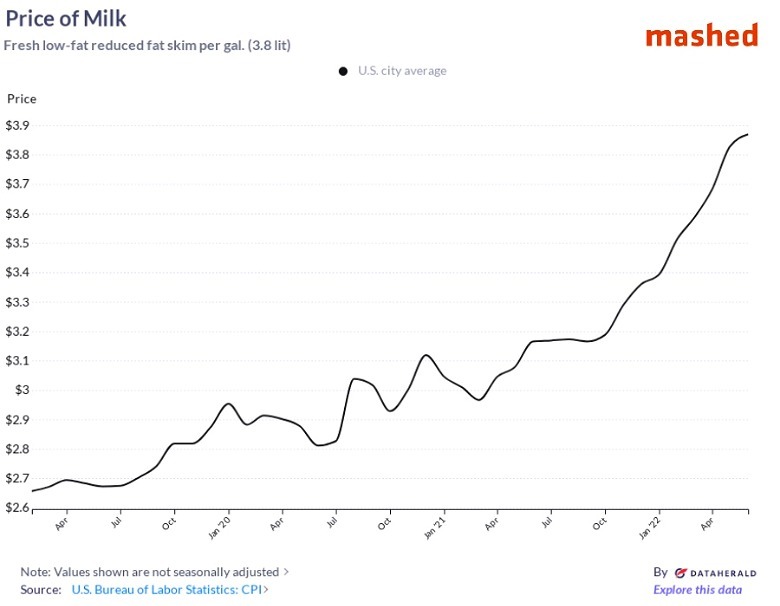 According to data accrued by the U.S. Bureau of Labor Statistics (BLS), the average price for a gallon of skim milk went from $2.65 in February 2019 to $3.51 in February 2022 which is a 32% increase over 3 years. Yet when you look at the last consecutive year alone when comparing June of 2021 with an average price of $3.16 to June of this year with the average being $3.86 that results in a whopping 22% increase in just 12 months.
