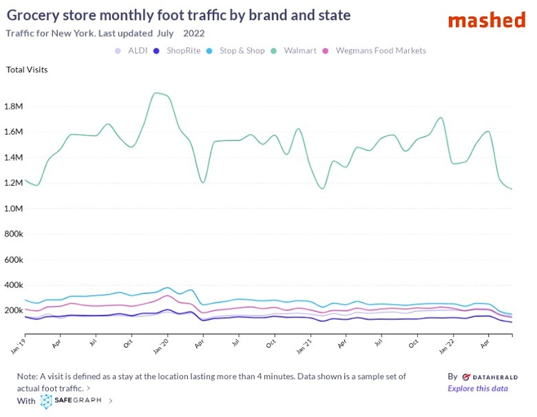 In data collected by the Bureau of Labor Statistics (BLS), over the last three years, Walmart has proven to be the most popular store in New York. Walmart's competitors, Aldi, ShopRite, Stop & Shop, and Wegman's Food Markets, have all maintained foot traffic in a consistent scope of 150,000-300,000 visitors per month. While Stop & Shop's range is slightly higher than the other three, it is no match for Walmart's numbers. As of April 2022, Walmart had 1,603,212 visitors while Stop & Shop saw 251,148 making Walmart's foot traffic over 6 times more significant than its competitors.