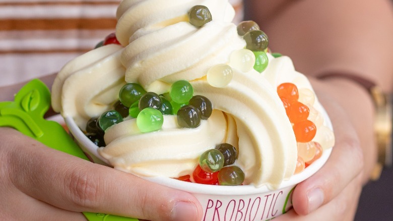 While the name suggests otherwise, did you know French vanilla flavor does not necessarily come from France? (via The Seattle Times) French vanilla refers to the French style of preparing the base of the ice cream with egg yolks, while regular vanilla ice cream does not. The vanilla itself could come from Mexico, Madagascar, or Tahiti, and the yolks give French vanilla ice cream a more yellow hue and a richer taste and consistency. For this reason, the French Vanilla Yogurtland flavor landed higher on our list than its average vanilla counterpart.