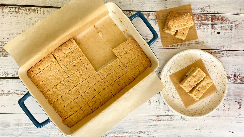 If you're a fan of the Apple TV+ comedy series "Ted Lasso," you've no doubt noticed the title character's penchant for baking and gifting his favorite shortbread cookies. While Lasso didn't share his recipe with us (being a fictional character pretty much precludes him from being able to do so), we feel that these vanilla-flavored shortbread fingers make for a reasonable facsimile of the cookies that are so often shown on the show.