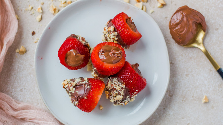 Strawberries are a fruit that has long been associated with afternoon tea, to the extent that there's even a specific name for the event: if you serve fresh strawberries along with your scones and clotted cream, you are hosting a strawberry tea. If you want to dress up your strawberries a bit, though, you can always hollow them out and fill them with a sweet spread like Nutella. If you'd really like to take things over the top as we do in this recipe, you can then dip the filled berries in melted chocolate and chopped nuts.