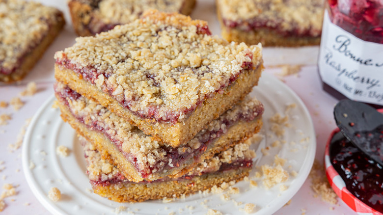 Bar cookies may not seem fancy enough for a tea party, but these raspberry ones are an exception in that the bright red jelly makes for an attractive contrast with the streusel topping. If you slice them into dainty fingers rather than hearty squares, they wouldn't look out of place alongside more elaborate confections. Unlike many other teatime recipes, though, this raspberry dessert stays true to its basic bar cookie roots by being quick and easy to put together