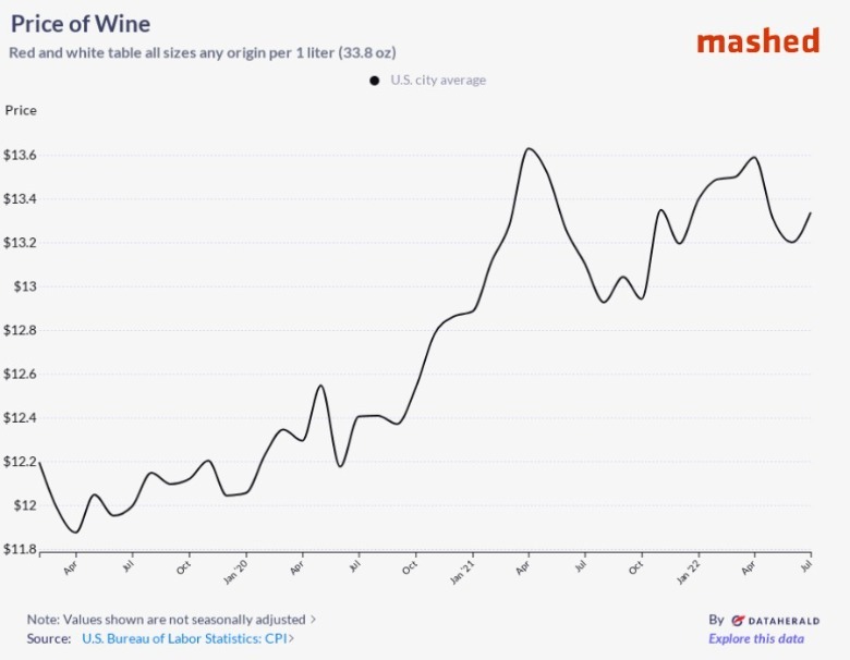 With the exception of a surge in 2021, the price of wine has been relatively mellow during inflation — at least in comparison to other consumer goods. According to data compiled by the U.S. Bureau of Labor Statistics, the average cost of a liter of red and white table wine in July 2022 ($13.33) was 2.1% lower than its high point in April 2021 ($13.62). Granted, the current price of wine is significantly higher than it was in mid-2019, but that can be chalked up to standard U.S. inflation rates, which jump an average of 3.8% per year (per WorldData).