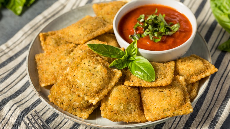 With over 4 billion views on TikTok, #airfryer produces videos of home cooks air frying everything from donuts to chicken thighs. However, there are two schools of thought when it comes to perfecting your air fryer ravioli recipe. Some cooks treat the ravioli like a chicken cutlet and bread the outside (via The Fresh Cooky). Other versions skip the breading and season the ravioli instead for a low-carb version. TikToker Kim Pauckner opts for the latter (via TikTok). In the video, she coats the frozen ravioli in olive oil and sprinkles garlic powder before air frying. Although the ravioli has no coating, the pasta gets golden brown and crispy.