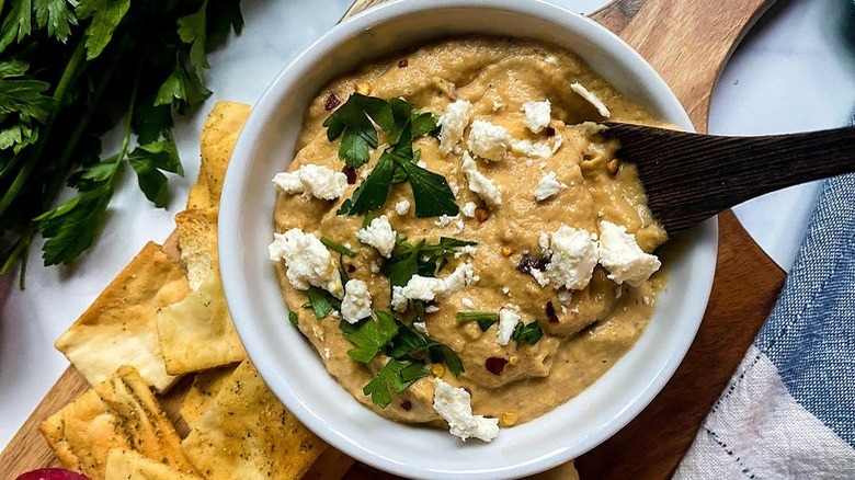 A creamy eggplant dip by any other name may well be baba ganoush, and that's exactly what you're getting here. This Middle Eastern classic starts with roasted eggplant, then drizzles it with olive oil before pureeing it with lemon juice, tahini, salt, and garlic. While this dip is plenty flavorful as-is, you could always stir in some parsley, paprika, or even some red chile flakes before serving it with pita chips or crudites.