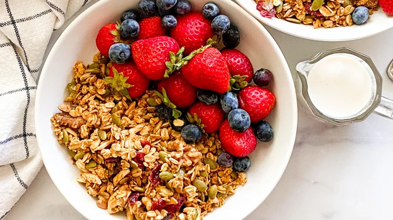Today's the day you stop buying granola and start making your own. With store-bought granola you're letting someone else decide what goes into the mixture; when you make your own you get to choose more of your favorite ingredients and skip any unwanted ones. This recipe has a blend of oats, nuts, and dried fruits like cranberries and raisins, and it all bakes together to become browned and crunchy. Use your 15-minute granola to make trail mixes, energy bars, or enjoy it with milk or yogurt for breakfast.